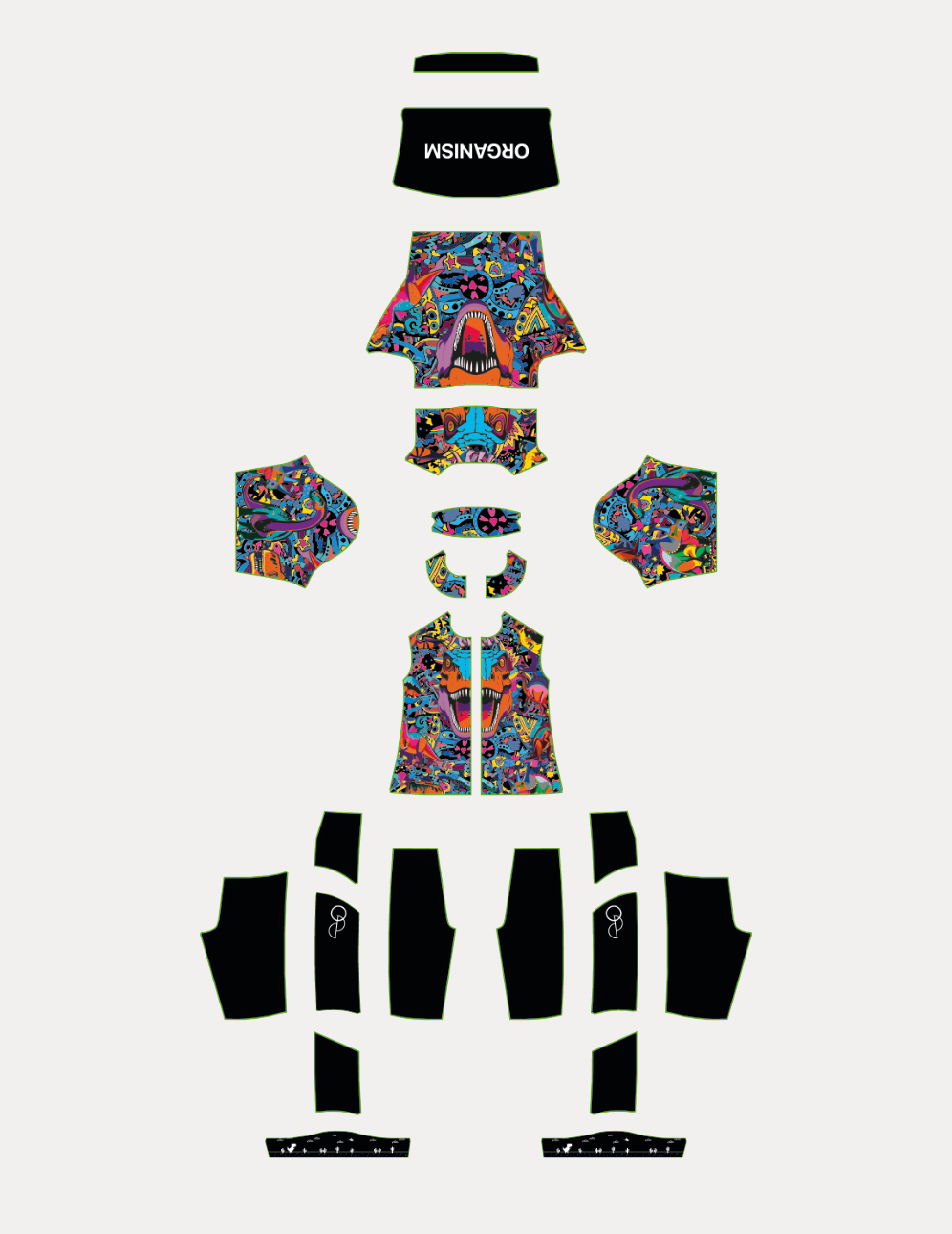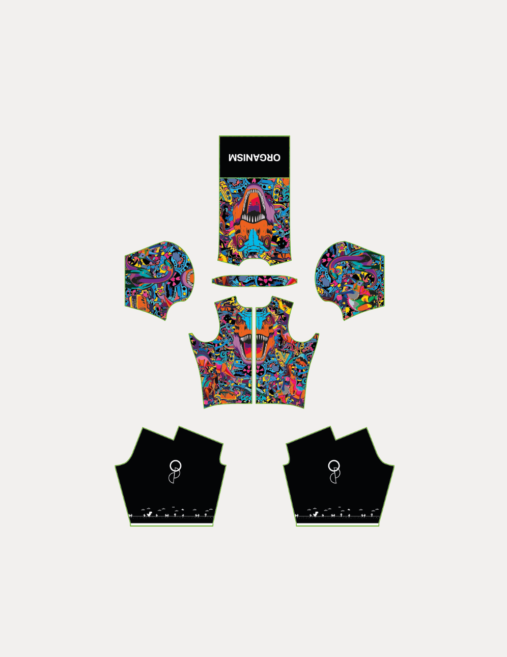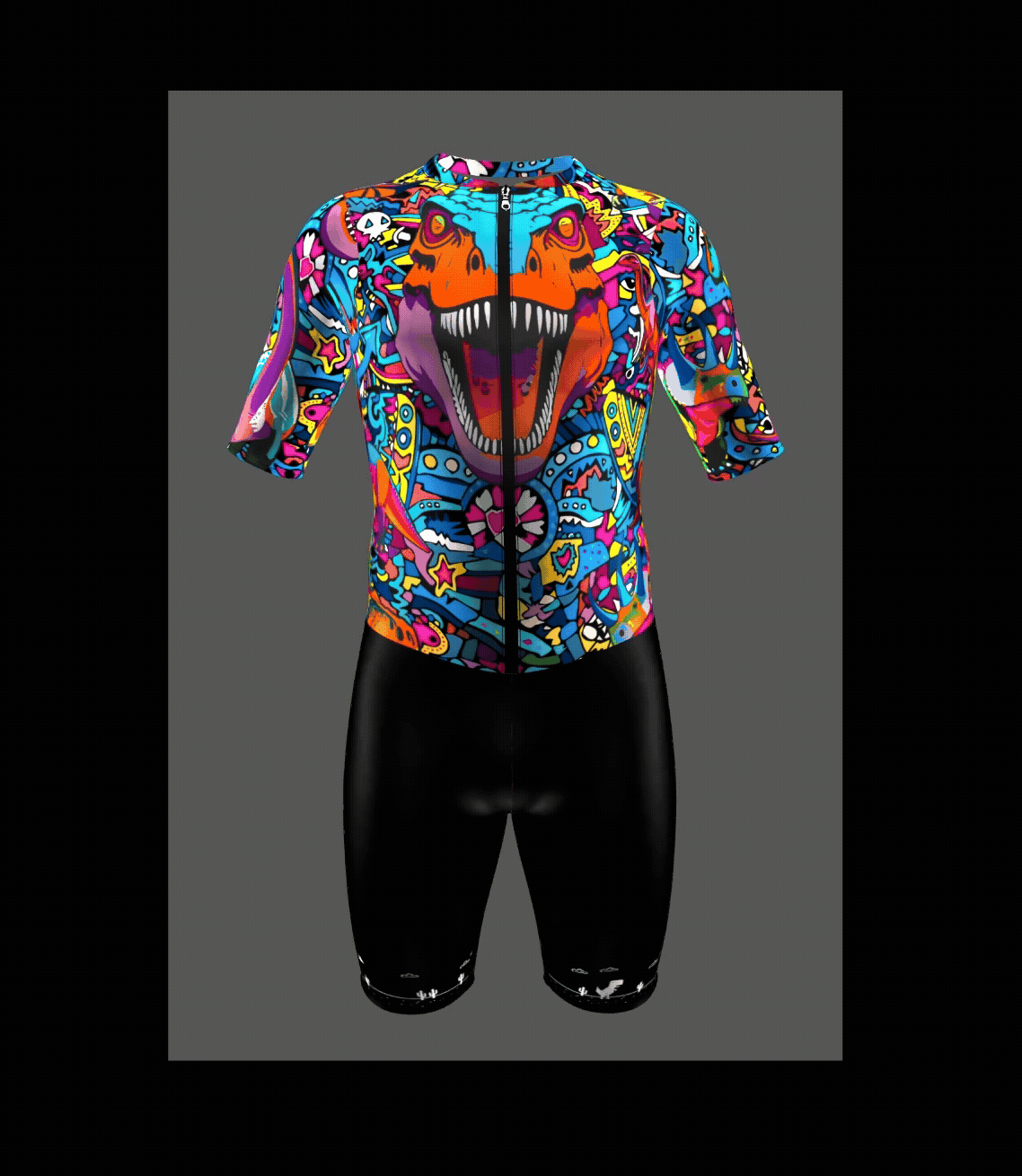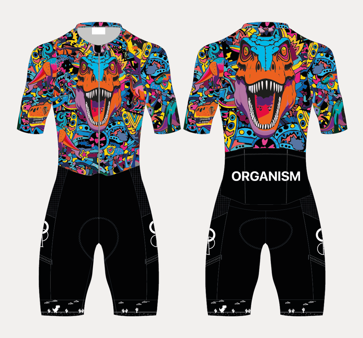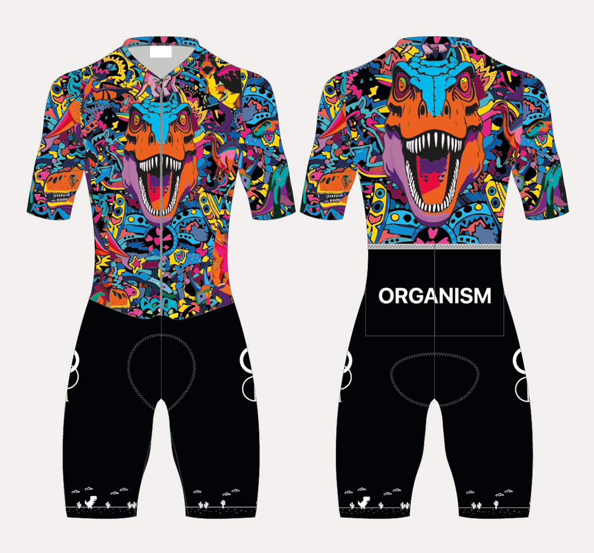 The jersey will feature an explosion of colourful dinosaur characters, capturing a sense of movement, playfulness, and energy. The shorts will remain primarily black with minimal white detailing, creating a sleek contrast to the vivid top. A small scene from the Google Chrome offline dinosaur game at the bottom of the legs. On the lower back, the word "ORGANISM" will be printed in all caps using SF Pro Display Bold font for a clean, modern statement. The sponsor logo “Organ Donor” will be placed thoughtfully on the sides near the hips, aligned with the Gravel suit pocket seams for both aesthetic and functional balance.
