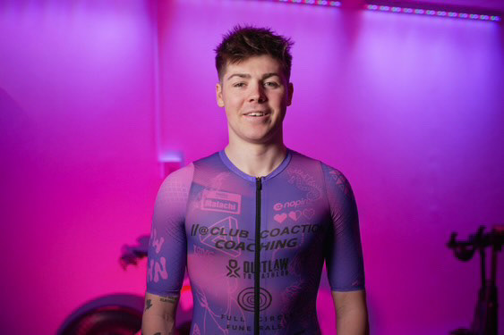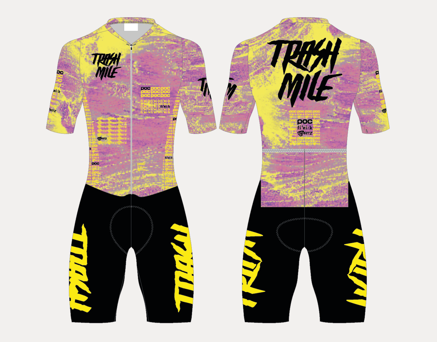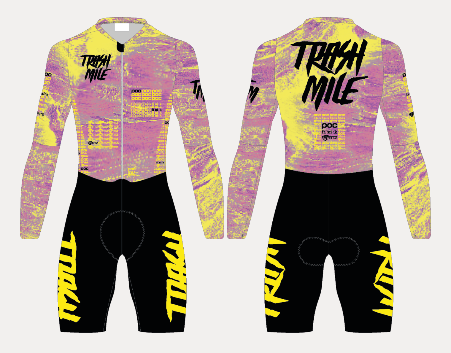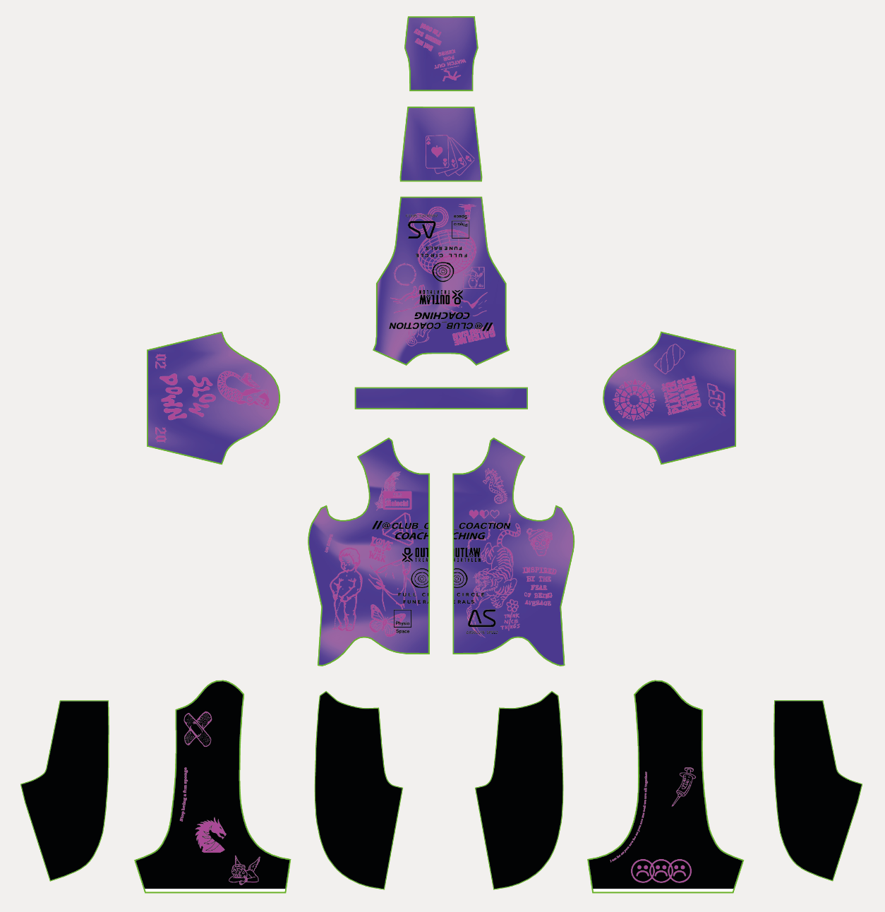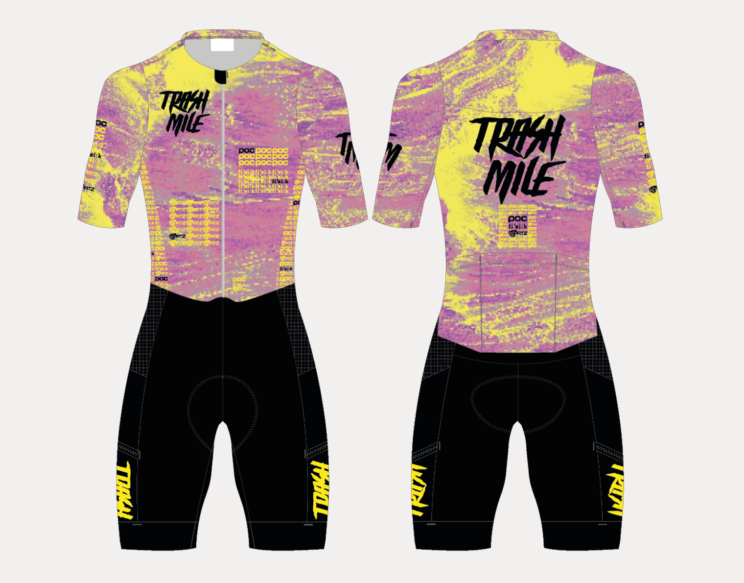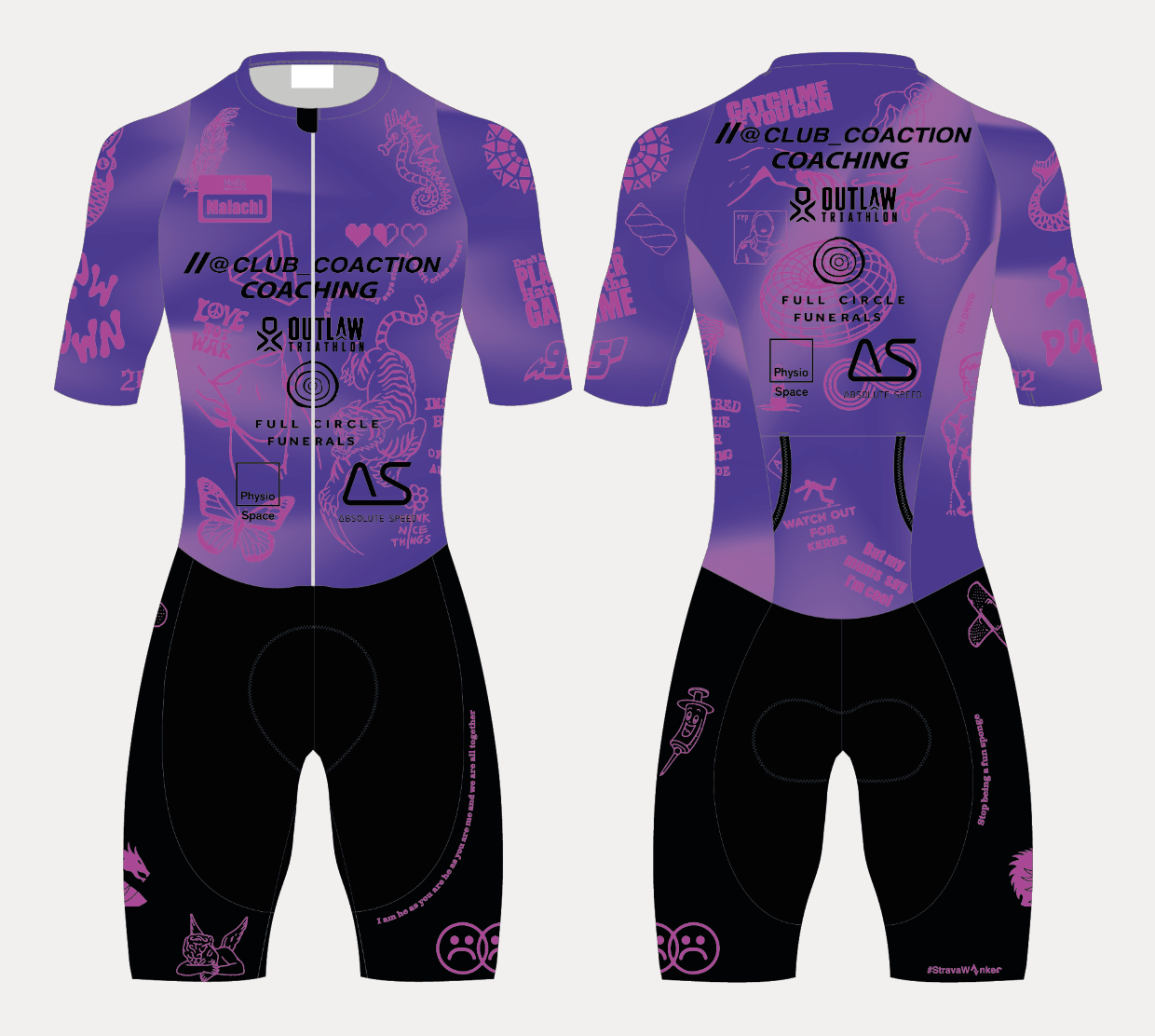 A bold, high-impact skinsuit that blends vivid colour with tattoo inspired artwork and personal storytelling. The top half will feature a lighter-than-Cadbury’s purple fade, paired with plain black shorts for a strong, graphic contrast.