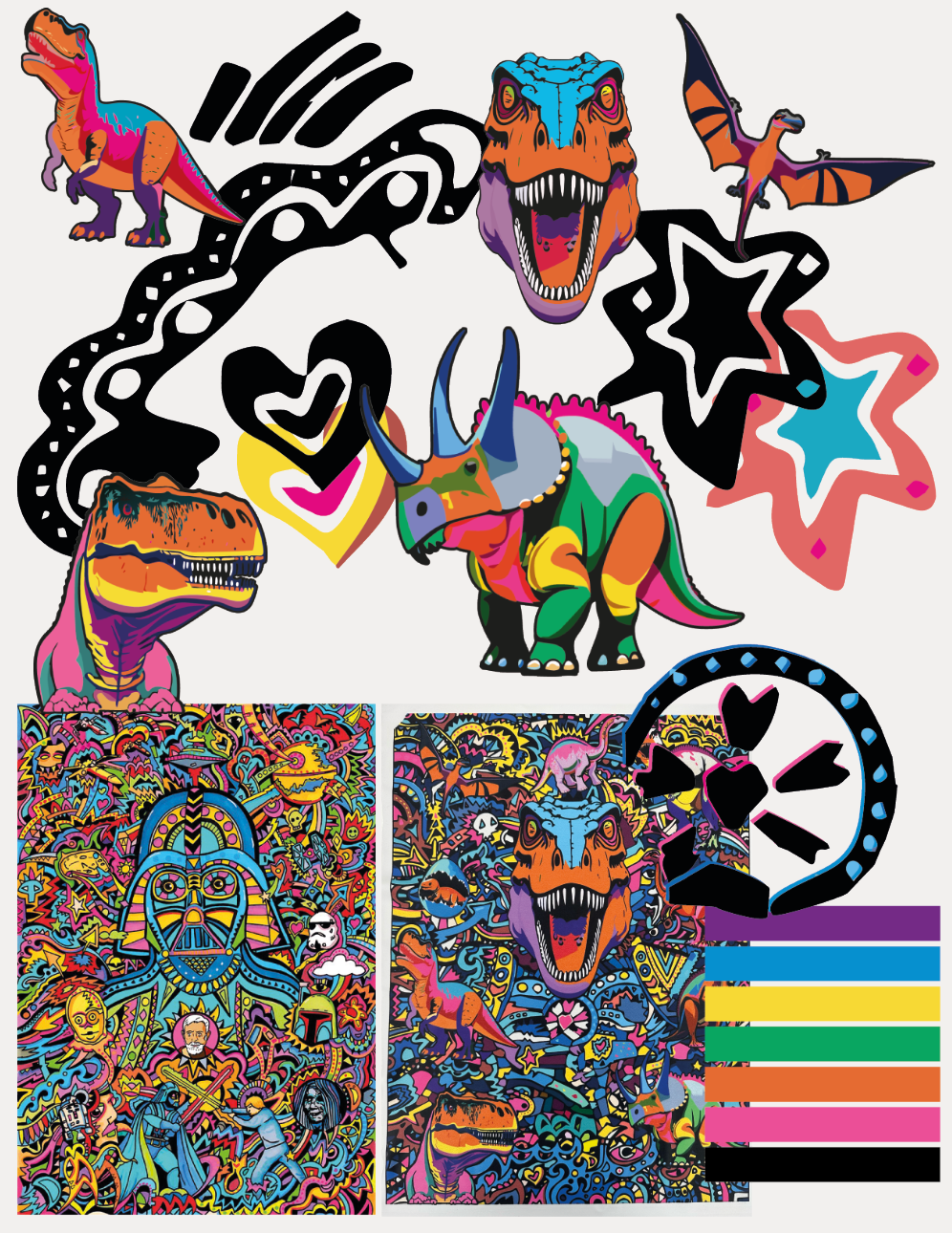 A bold, vibrant skinsuit design centered around dynamic, cell- shaded dinosaurs, taking inspiration from the colourful, energetic style of Manic Minotaur’s "Stormtrooper" illustration. This artwork will be adapted for both Gravel and RR suits.