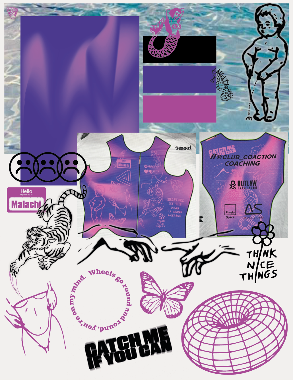 Hot pink tattoo patchwork-style drawings will overlay the purple background, with key elements placed intentionally: a plaster on the right hip, a syringe on the bum cheek, “Catch me if you can” across the shoulder, and a “My name is Malachi” badge on the chest. Additional artwork will fill the space to create a cohesive, energetic look. The black shorts will continue the hot pink tattoo design to maintain a seamless flow.